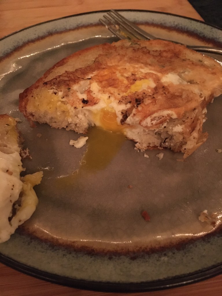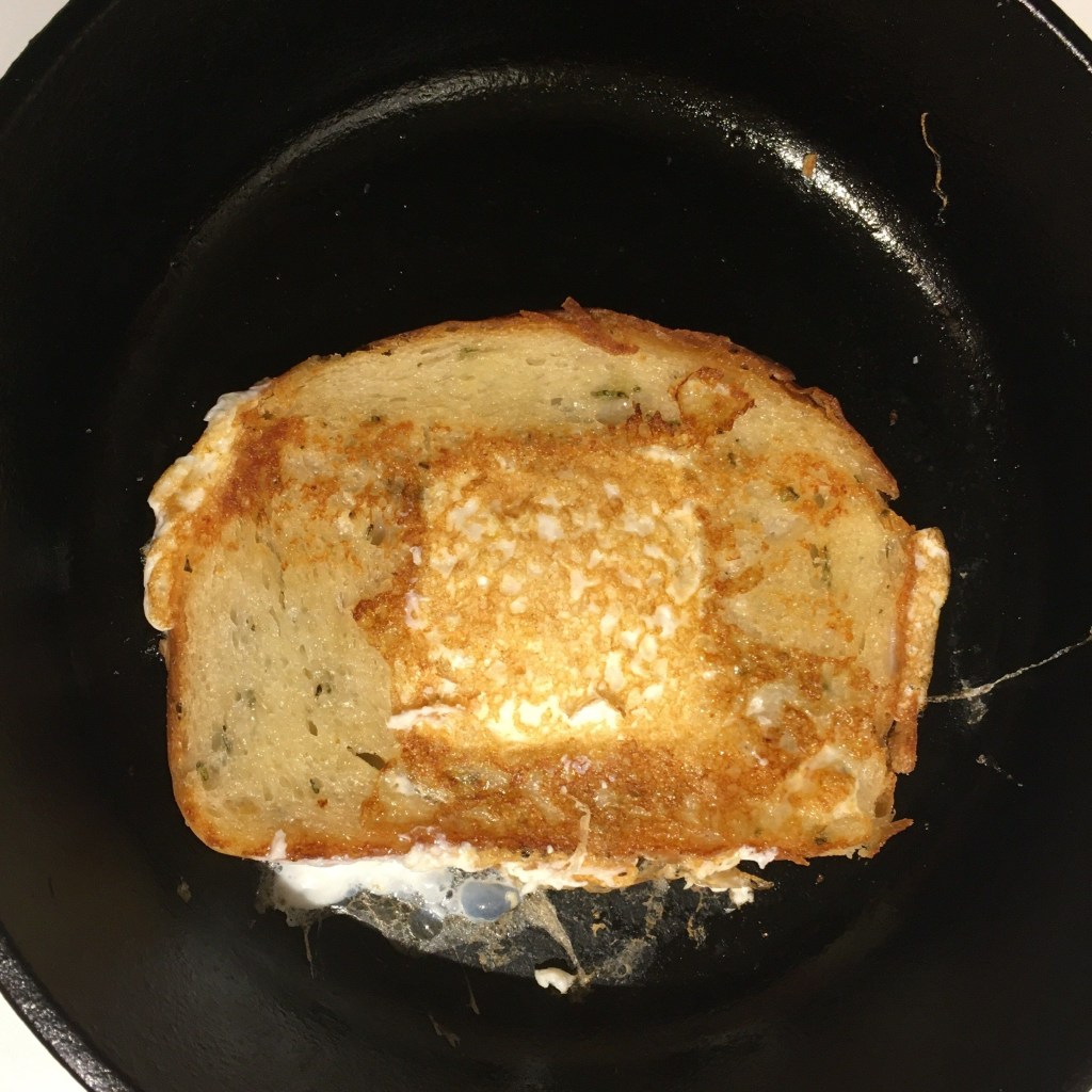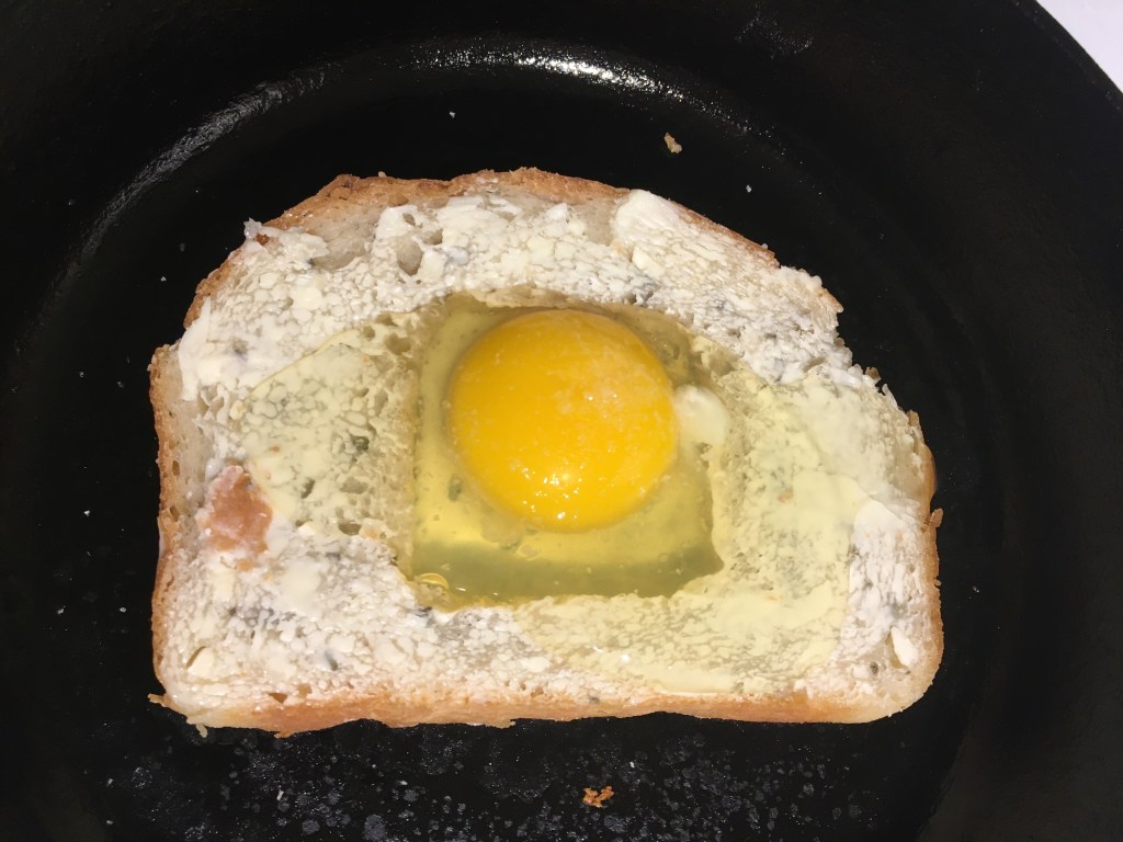 Oh yes. The smell of rosemary is getting me high, and the toast has soaked up the butter from the pan that’s browned a little. I feel like I’m going through a small spiritual journey, and I haven’t even got it on the plate yet. Why haven’t I made this sooner? Look at that splat. Gorgeous. I’m in love. And the yolk?